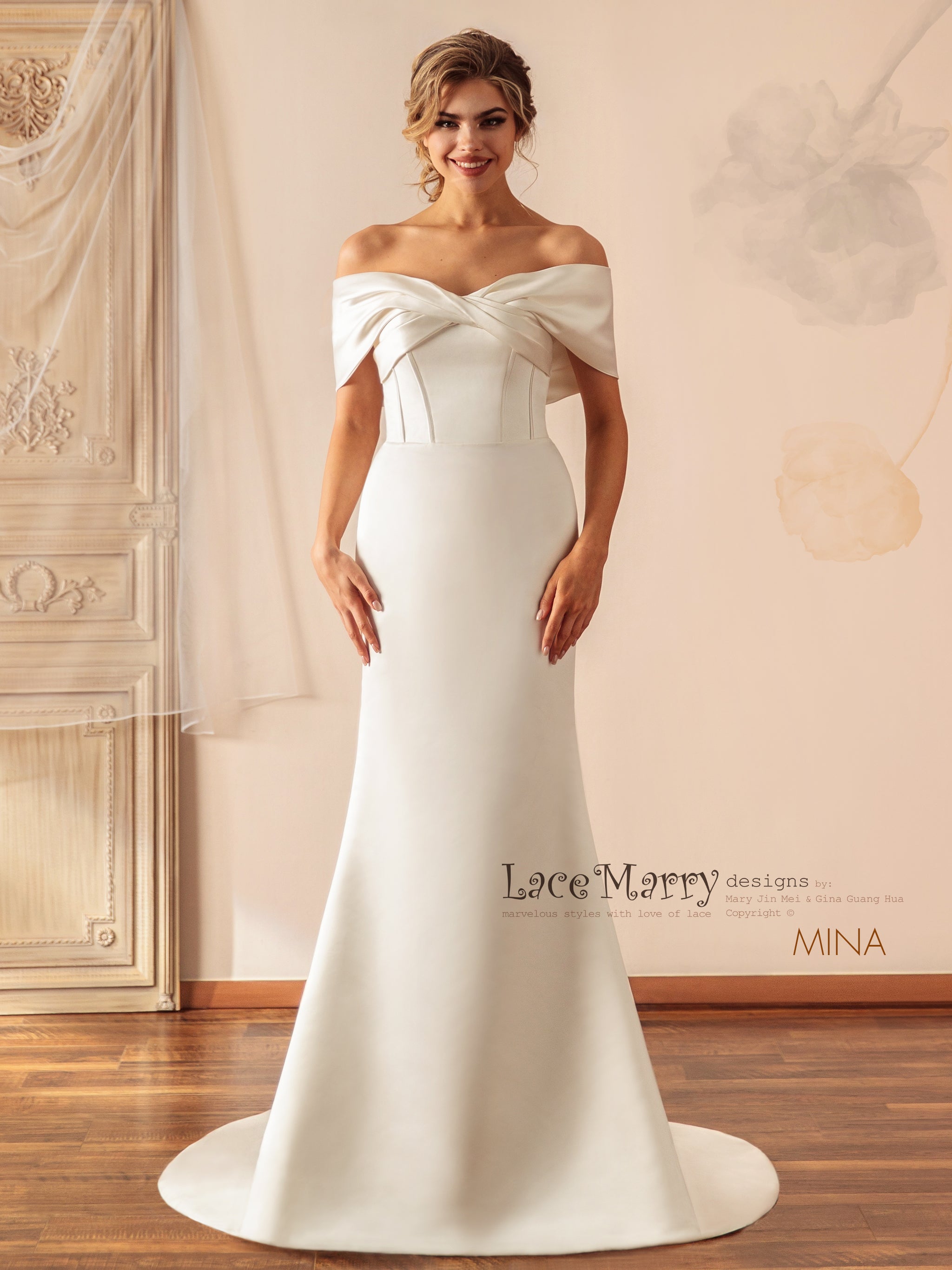 Mina Off Shoulder Satin Wedding Dress Lacemarry