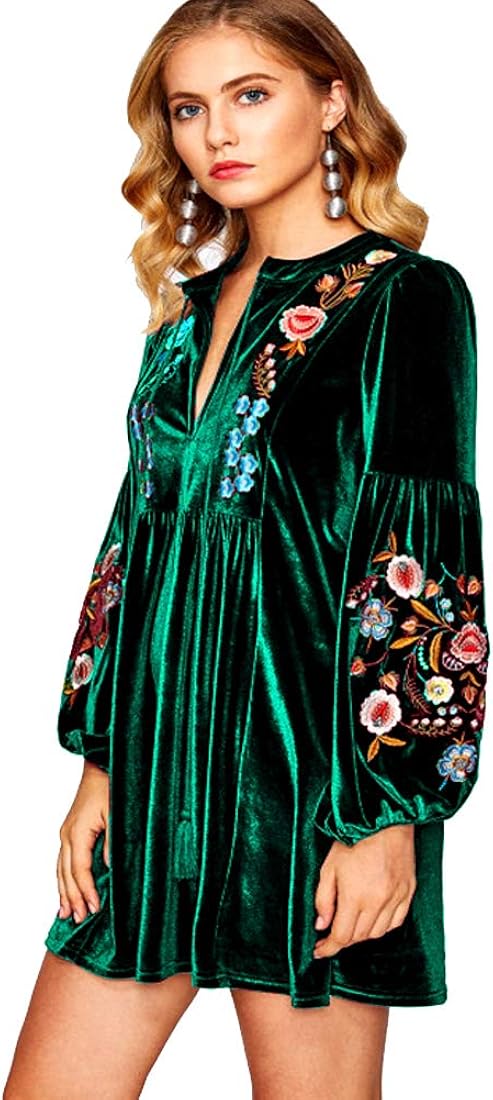 Buy Aox Women Retro Lanter Sleeve Floral Embroidered Boho A Line Loose Short Shift Swing Dress Green Sr019 Velvet Small At Amazon In